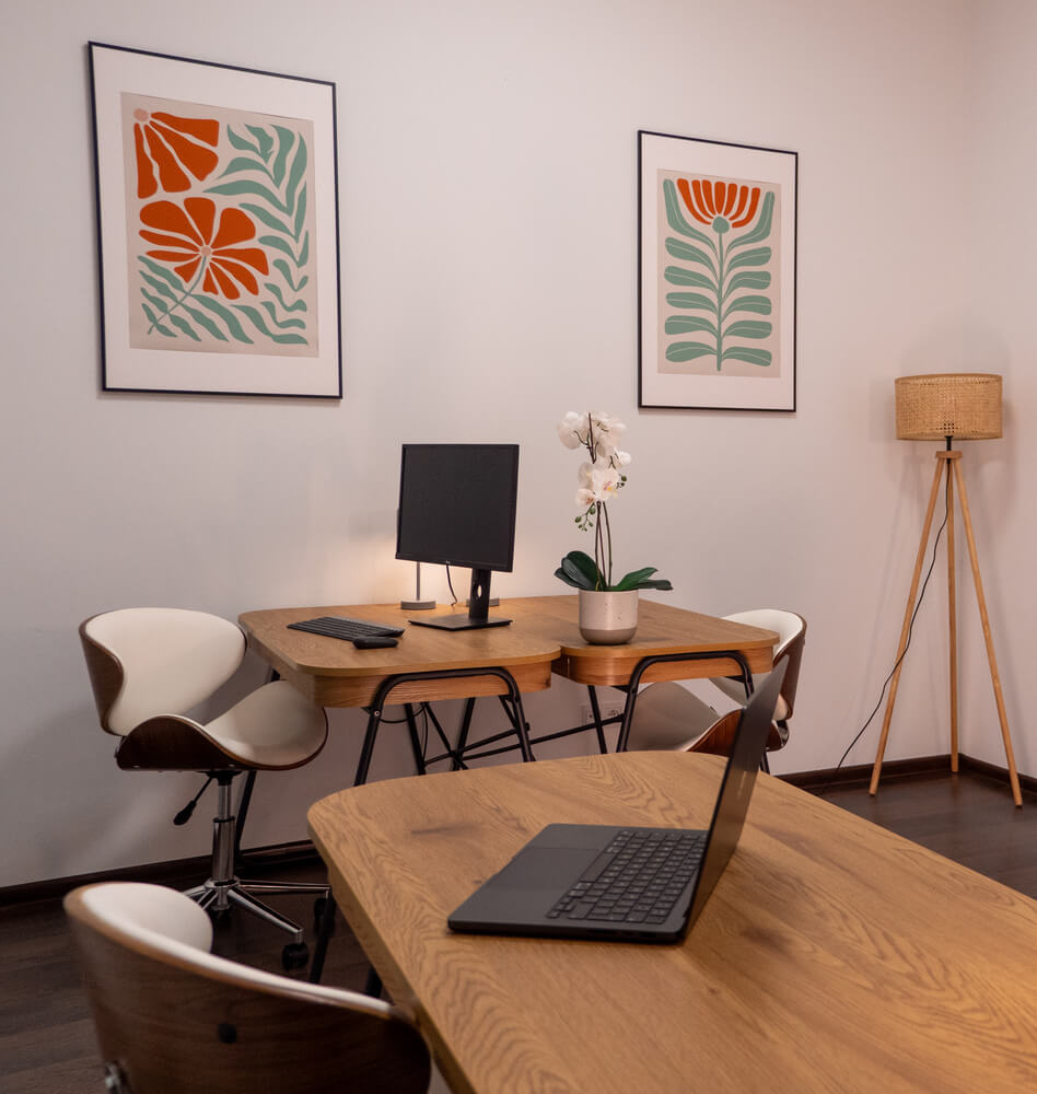 Nasza sala konferencyjna to funkcjonalne i eleganckie w pełni wyposażone wnętrze dla spotkań do 8 osób.Jasne wnętrze, duże okna i elegancki design tworzą atmosferę sprzyjającą skupieniu i twórczym rozmowom.Perfekcyjna do ważnych negocjacji, warsztatów czy codziennych odpraw zespołu.